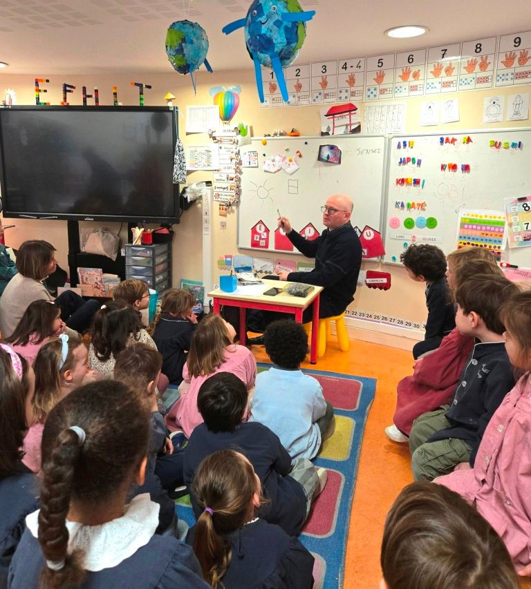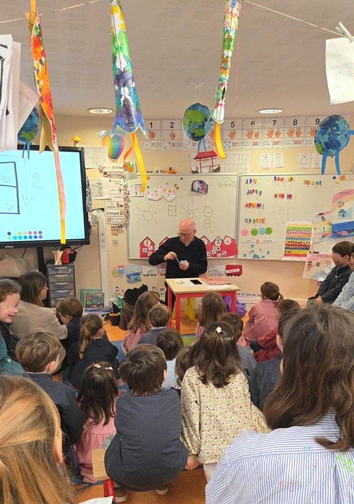 Virginie, très intéressée par le Japon, nous a faits intervenir à deux reprises les années passées auprès de sa classe, à la fois pour compléter les nombreux apports qu’elle propose à ses élèves et également pour leur faire découvir un autre mode d’écriture, à un âge où ils apprennent notre alphabet.
